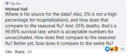 In the data he cited some statistics about people who are unvaccinated. He stated that 1 in 20 people who are unvaccinated and contract covid will be hospitalized. He then said that I in 200 of unvaccinated people will die. That translates to 5% of unvaccinated people are hospitalized and there is a 99.95% survival rate. I would say that those are excellent statistics for unvaccinated people and I say they actually debunk the necessity of a vaccine. But that’s just my opinion. The other question I posed was what the source was for his data he cited.